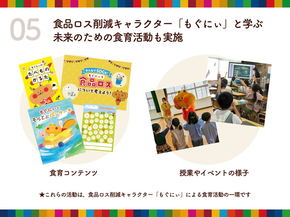また、地域での食品ロスへの理解を深めるため、食品ロス削減キャラクターの「もぐにぃ」による食育活動も実施しております。